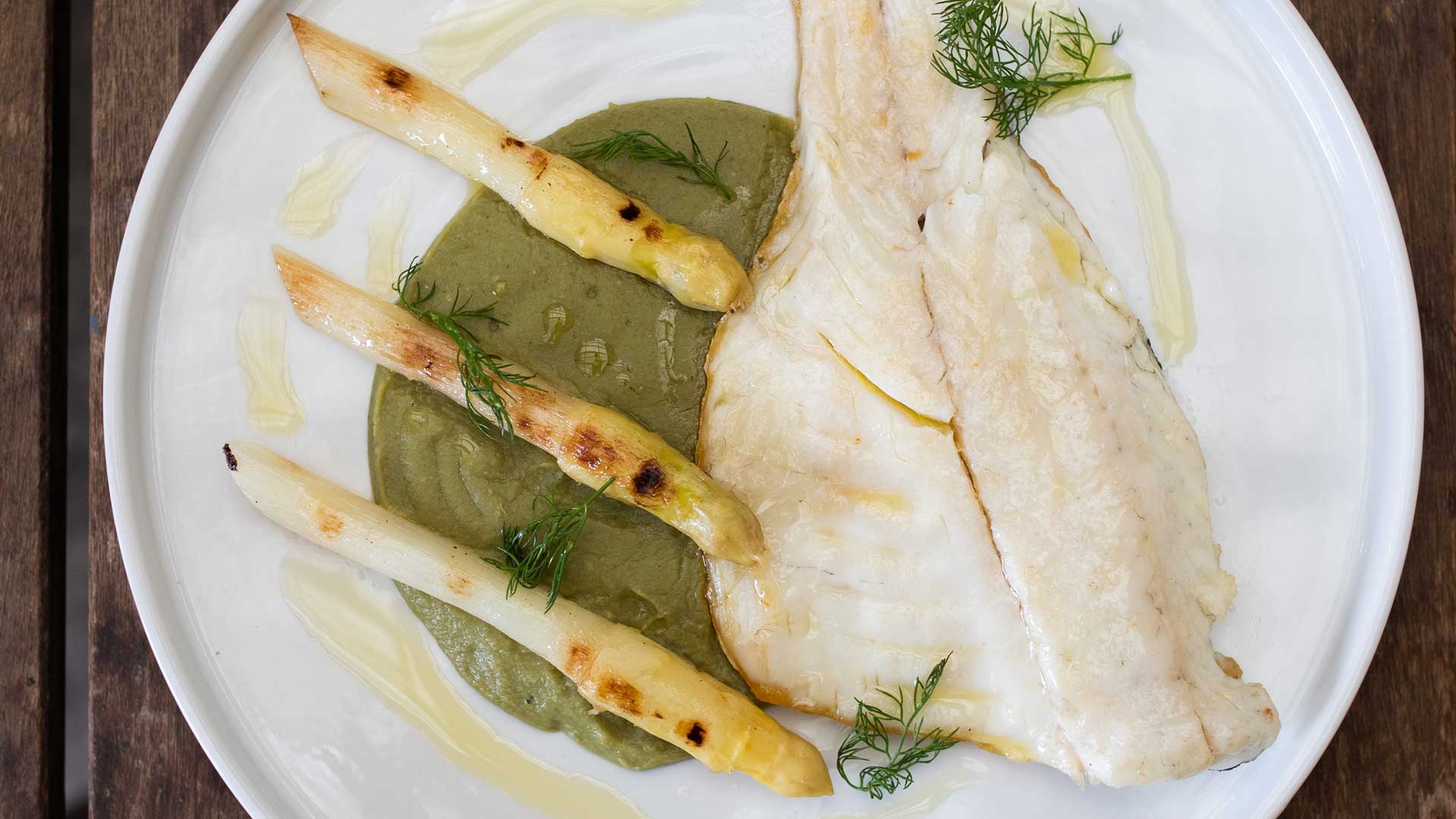 Fare una base utilizzando un coppapasta (oppure modellare un foglio di allumino per farlo diventare un anello con bordi di circa 1-2 cm), appoggiare il filetto di orata e per ultimo gli asparagi. Un giro d’olio, qualche ciuffo di finocchiella e il piatto è pronto per essere portato in tavola.