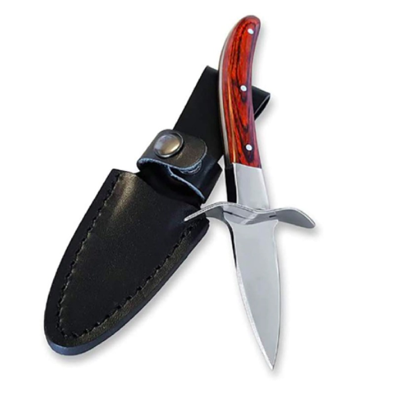 coltello per ostriche con lama in acciaio inox e custodia in pelle.